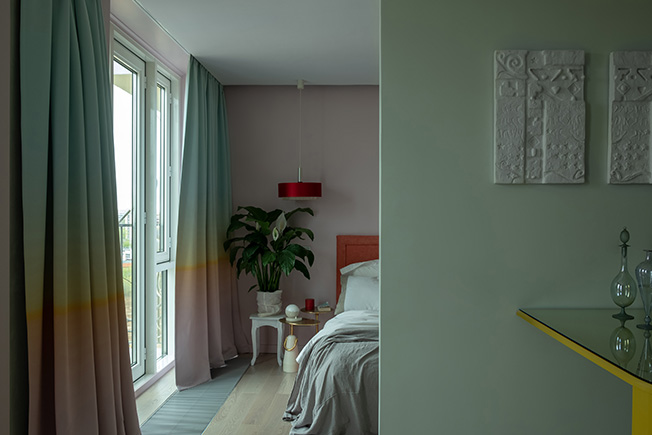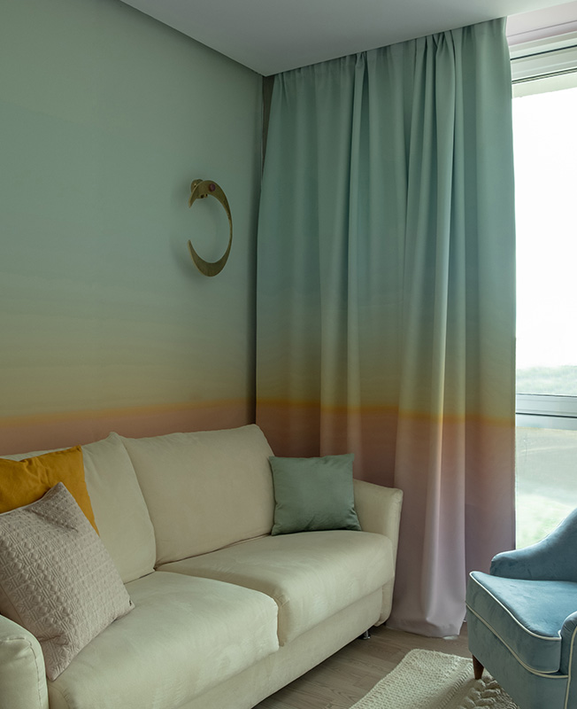 Обои и шторы в градиенте выполнены мастерской Solstudio Textile Design по проекту Павла Воловова. Бра и столика — также его разработки: Павел успешен как предметный дизайнер.