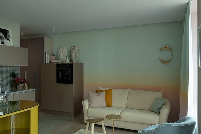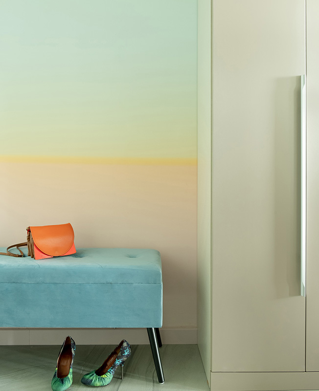 Необычный декор с градиентом начинается в прихожей и тянется вдоль всей стены.