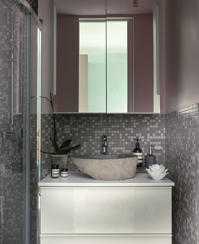 Каменная раковина произведена в Индонезии — после поездки на Бали хозяйка мечтала именно о такой. С ней гармонирует мозаика в серых оттенках. Простая мозаика — вполне бюджетный материал, однако укладка и затирка, по признанию Павла Воловова, обошлись довольно дорого.