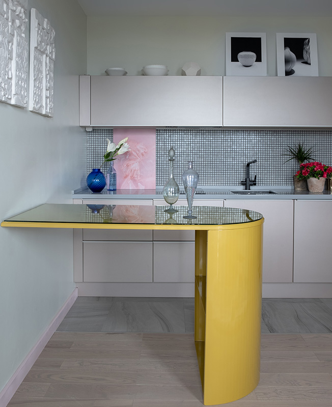 Компактный стол спроектировал Павел Воловов, а изготовили, как говорит дизайнер, «на дружественном лодочном производстве». Стол служит и обеденным, и рабочим, а также продолжением столешницы кухни. На стене гипсовые рельефы Кати-Анны Тагути.