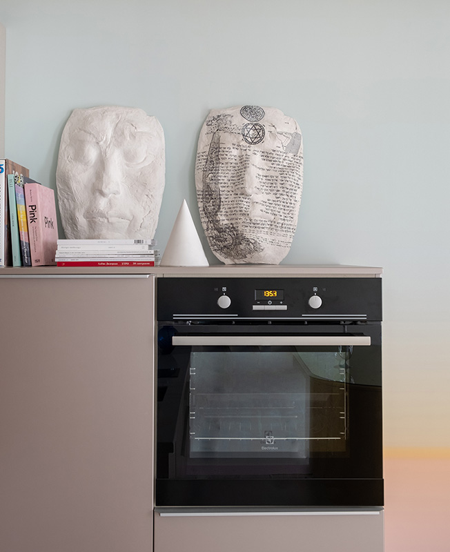 Дизайнер сделал верхние кухонные модули невысокими, а стену над ними оставил открытой — чтобы, по его выражению, «не красть воздух», визуально расширить пространство. Для той же цели не стал возводить шкаф-колонну до потолка.