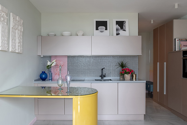 Кухонный шкаф-колонну дизайнер не стал возводить до уровня шкафов в зоне прихожей — чтобы не перегружать объем, оставить воздух. К тому же на верхней плоскости шкафа можно разместить красивые предметы.