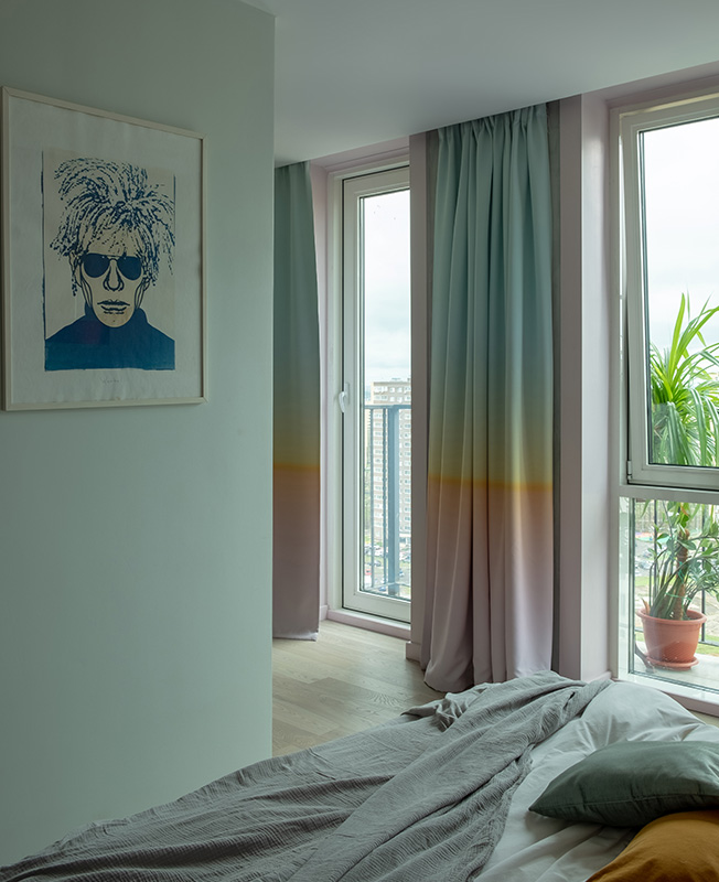 Сейчас спальня — часть единого пространства, отделенное простенком, но позднее будет установлена раздвижная дверь из матового стекла Портрет Энди Уорхола — работа Романа Минаева.