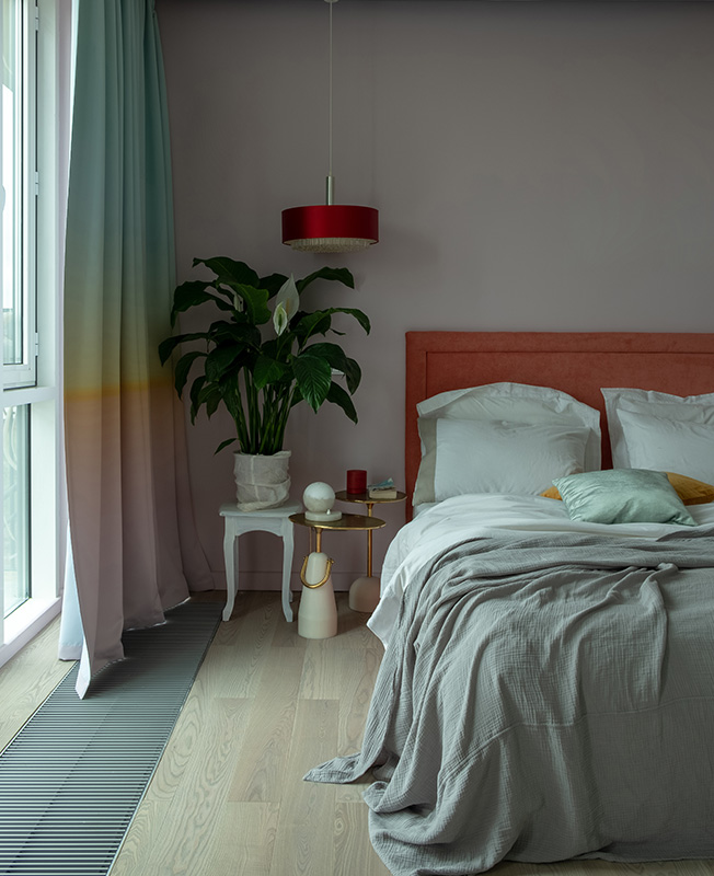 Винтажный плафон 1980-х привезен из Италии. Предмет цвета яркой губной помады хорошо вписался в дамскую квартиру. Приставные столики из латуни и композита — дизайн Павла Воловова, изголовье кровати также выполнено по его наброску.
