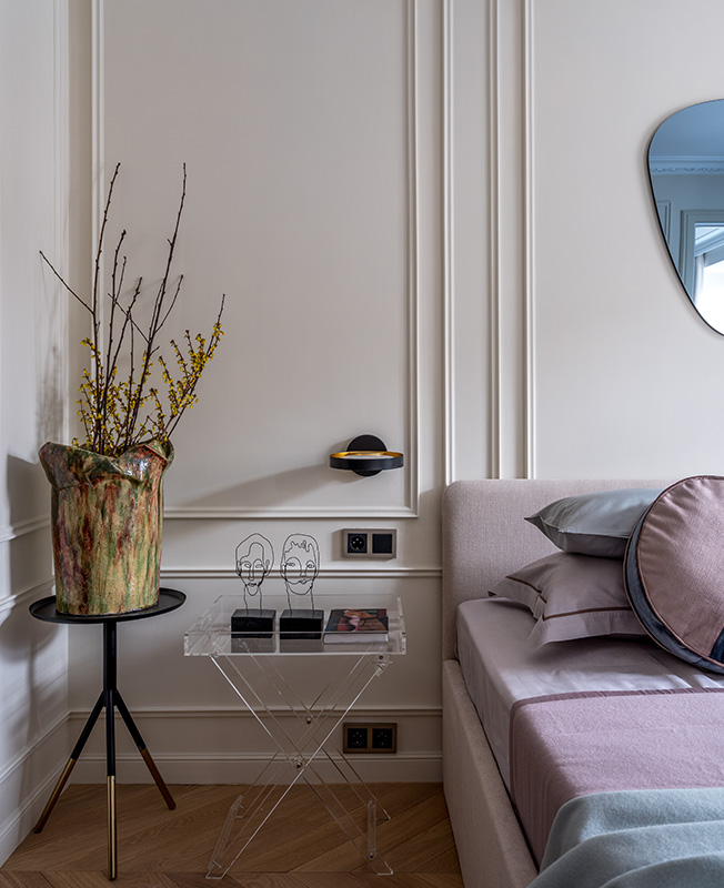 Спальня. Скульптуры из проволоки: Татьяна Клят (галерея ArtBrut Moscow). Столик и зеркало Zara Home. Постельное белье Ateliertati. Декоративные подушки Enere.