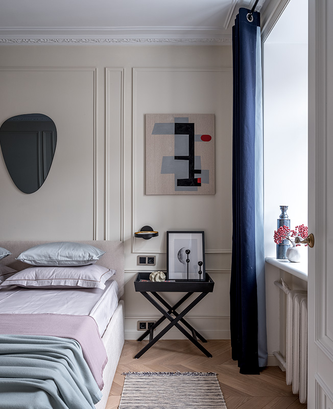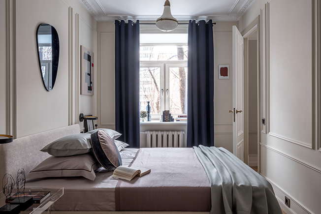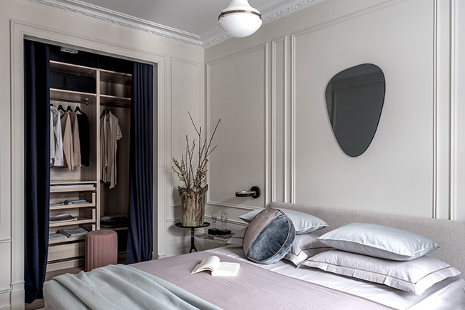 От длинной и узкой спальни отрезали часть, создав гардеробную. Ее отгородили занавесом — элегантное и экономичное решение. Постельное белье Ateliertati. Декоративные подушки Enere. Зеркало Zara Home.
