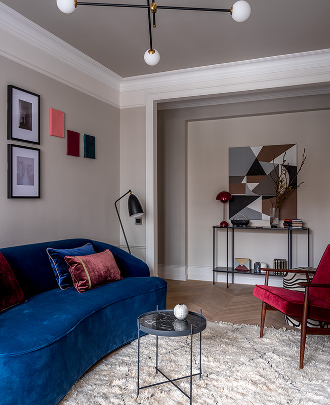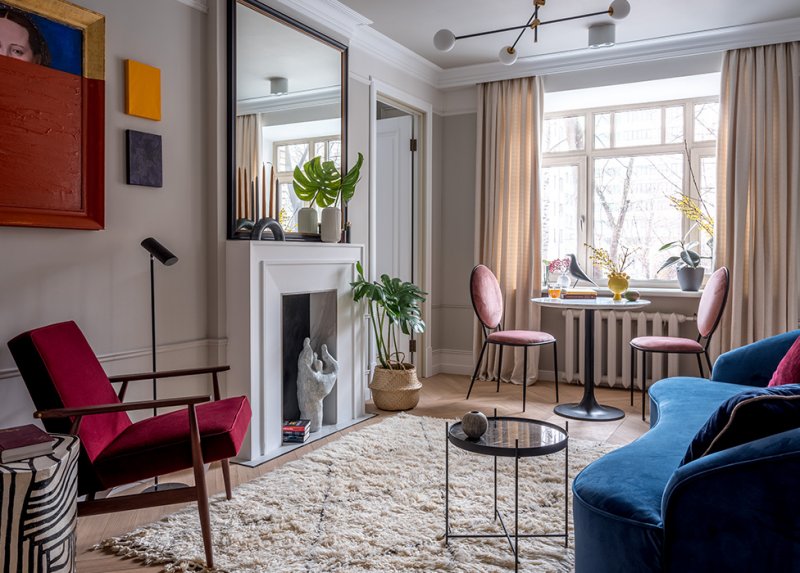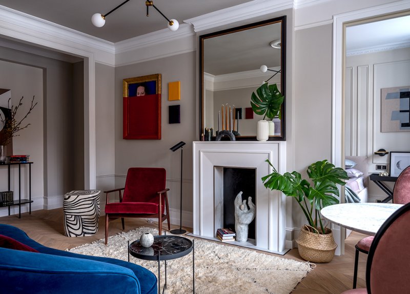 Декоратор создала нейтральный фон с классическими элементами: лепным карнизом, высоким плинтусом, паркетом елкой, фальш-камином. Затем наполнила его более современными предметами мебели и яркими акцентами.