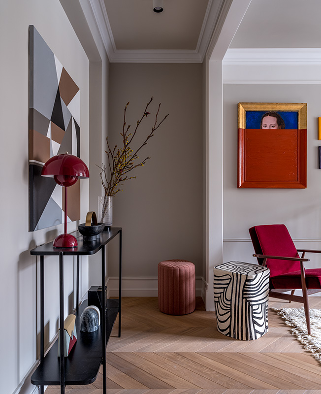 Бывший коридор фактически присоединен к гостиной благодаря широкому проему. Консоль изготовлена на заказ в мастерской Esotbor. На ней лампа &tradition дизайна Вернера Пантона. Керамический пуф: Savour Design. Арт: Карина Гайгер и Анна Тяшкун (Творческая мастерская Арт Намалевич)