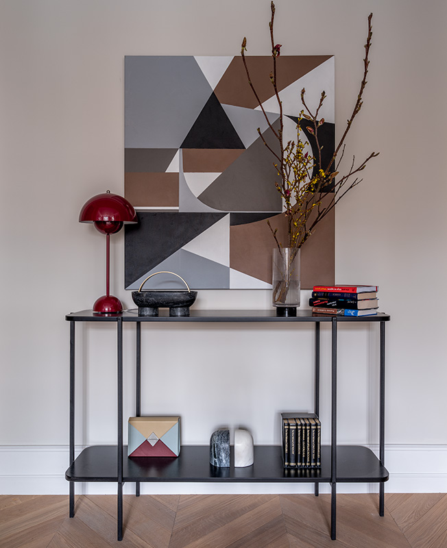 Консоль изготовлена на заказ в мастерской Esotbor. На ней лампа &tradition дизайна Вернера Пантона. Керамический пуф: Savour Design. Арт: Карина Гайгер.
