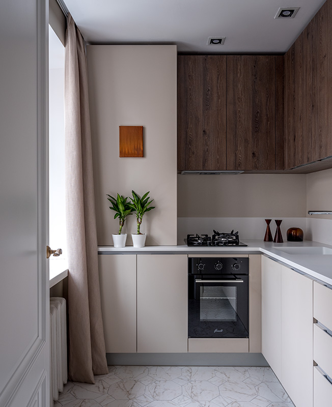 На маленькой площади кухню решено было сделать современную и лаконичную. Неправильную геометрию помещения и газовую трубу удалось скрыть за счет конструкции шкафов. Мебель: «Стильные кухни».