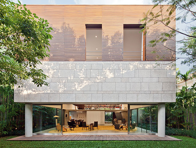 Одна из особенностей «тропического модернизма», как называет свой стиль И. Вайнфельд, — наличие элементов из темных пород древесины, даров местных ливневых лесов.