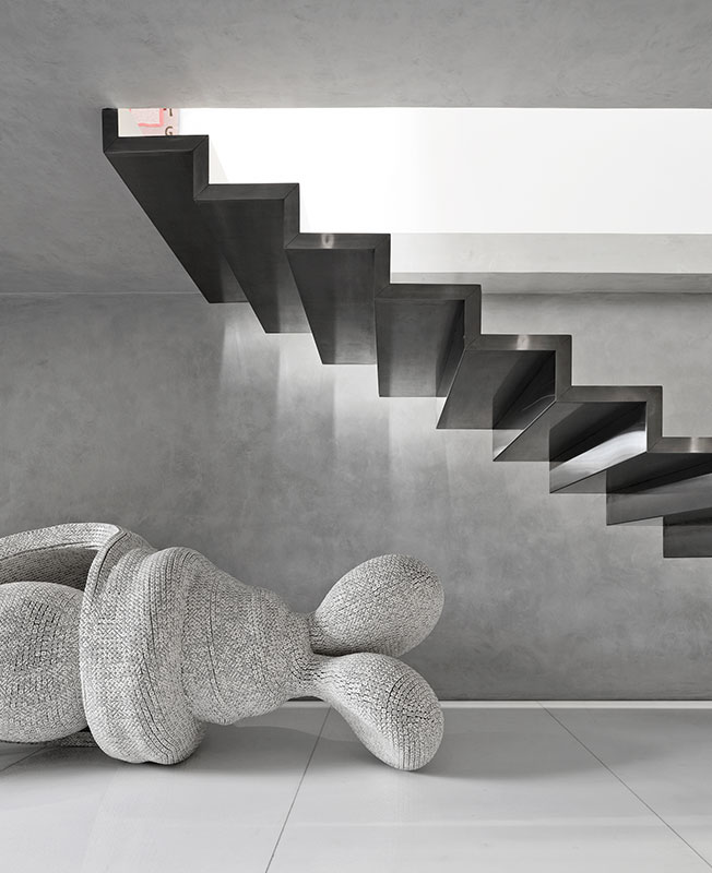 С потолка свисают манекены Энтони Гормли, отлитые из свинца и стекловолокна (1992). Хозяева приобрели инсталляцию давно. Однако до появления Casa Cubo у них не было достаточно места для ее экспонирования. Ковер на наливном бетонном полу, сотканный по эскизу автора проекта, напоминает песчаный пляж.