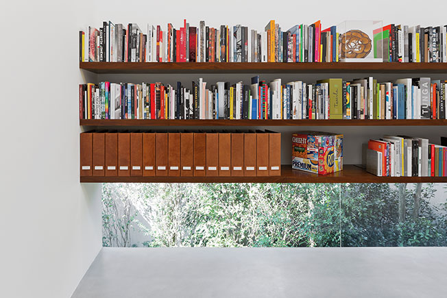 Вайнфельд предпочитает архитектурную мебель. На галерее пространство от стены до стены он занял деревянным стеллажом по своему проекту, между нижней полкой и полом — полоса прозрачного стекла.