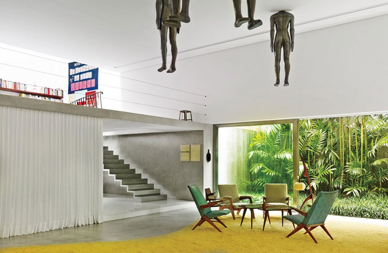 Дом-галерея Casa Cubo в Сан-Паулу — феноменальное простраство. На глазах у его архитектора Исая Вайнфельда родились и выросли трое сыновей владельцев «дома-куба», а также сложилась их богатая интересная арт-коллекция. Исай Вайнфельд признается критиками самым известным бразильским архитектором после Оскара Нимейера. За почти сорок лет практики он возвел не один десяток особняков. В основном они сосредоточены в Сан-Паулу и окрестностях, причем четыре, включая Casa Cubo, выстроены на одной и той же улице в фешенебельном районе Жардин. Трехуровневое здание площадью 715 кв. м расположено в районе Жардин, одном из самых благополучных и зеленых в Сан-Паулу. «Друзья говорят, что ее следовало бы назвать моим именем», — сообщает Вайнфельд. Каждая его постройка подогнана под клиента — неслучайно архитектор любит повторять, что создает дома, как Карл Лагерфельд создавал кутюрную одежду. И дает парадоксальную гарантию индивидуальности объекта: «Ни в одном доме, который я спроектировал с полной отдачей, ни за что не стал бы жить сам». По стальной, пружинящей при каждом шаге лестнице без ограждений и опор, ведущей на галерею, Вайнфельд не рекомендует подниматься после более чем двух бокалов вина. На полу — скульптура Secretions, автор Тони Крэг, 2001. Со своими клиентами Вайнфельд культивирует близкие, почти семейные отношения, более типичные для врача или адвоката. Совсем начинающим автором, еще до того как получить диплом, он спроектировал дом для матери владельца Casa Cubo; позже, лет тридцать назад, — первую квартиру для него самого, только что женившегося, еще позднее — первый дом. Первый этаж благодаря раздвижным стеклянным стенам образует единое целое с садом. В доме использована мебельная классика середины XX в.: дизайн Алваро Аалто, Лино Бо Барди, Джо Понти, Хосе Занина Кальдаса. С потолка свисают манекены Энтони Гормли, отлитые из свинца и стекловолокна (1992). Хозяева приобрели инсталляцию давно. Однако до появления Casa Cubo у них не было достаточно места для ее экспонирования. Ковер на наливном бетонном полу, сотканный по эскизу автора проекта, напоминает песчаный пляж. С потолка свисают манекены Энтони Гормли, отлитые из свинца и стекловолокна (1992). Хозяева приобрели инсталляцию давно. Однако до появления Casa Cubo у них не было достаточно места для ее экспонирования. На глазах Вайнфельда родились и выросли трое cыновей этой пары, сложилась арт-коллекция. Он гордится тем, что посоветовал им приобрести одну из первых работ: шелкографию Энди Уорхола с изображением Ингрид Бергман. С тех пор семья накопила одно из самых уважаемых собраний в Бразилии. Свой дом они задумывали как центр искусств и поддержки художников, но со всеми необходимыми составляющими домашнего комфорта. Вайнфельд предпочитает архитектурную мебель. На галерее пространство от стены до стены он занял деревянным стеллажом по своему проекту, между нижней полкой и полом — полоса прозрачного стекла. Вайнфельд почеркивает: «Здесь нет подушечек на диване, здесь устраивают приемы и выставки, а не сидят перед телевизором». В то же время он убежден, что даже самая аскетичная по форме архитектура может быть человечной. Надо только уметь одушевлять монументальные пространства. Одна из особенностей «тропического модернизма», как называет свой стиль И. Вайнфельд, — наличие элементов из темных пород д
