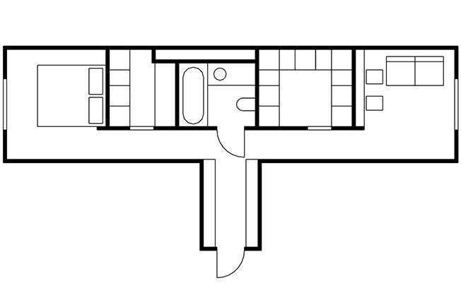 В жилых домах коридорного типа в торце здания обычно получаются квартиры, которые традиционно называют распашонками. Коэффициент полезной площади в таких пространствах очень маленький, т.к. большую часть помещения занимает коридор, от которого невозможно избавиться из-за ориентации на две стороны дома.