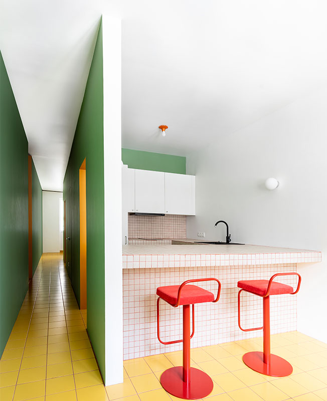 Архитекторы Борис Денисюк и Ангелина Малышева, buro5, оформили квартиру со сложной планировкой и площадью всего 42 кв. метра. В жилых домах коридорного типа в торце здания обычно получаются квартиры, которые традиционно называют распашонками. Коэффициент полезной площади в таких пространствах очень маленький, т.к. большую часть помещения занимает коридор, от которого невозможно избавиться из-за ориентации на две стороны дома. В данном случае архитекторы приняли решение сделать коридор главным достоинством квартиры. «В наших проектах планировка является основой интерьера. Обстановка и колористическая палитра отталкиваются от пространственного решения», — рассказывают архитекторы. Коридор дает объем и формирует перспективу. Дверь в ванную комнату расположена по центру напротив входа. Симметричные блоки кухни-гостиной и спальни находятся по бокам. С одной стороны кухня отгорожена стеной, а с другой — низкими шкафами со столешницей, которая формирует барную стойку. Проход на кухню и в гардеробную, прилегающую к спальне, выполнены в виде дверных проемов без полотна. Концептуально интерьер исполнен очень минималистично. В отделке использовано всего несколько оттенков краски и квадратная плитка разных форматов. Набор мебели аскетичен и функционален. nonehttps://www.instagram.com/burofive/https://www.facebook.com/burofive/https://burofive.ru/