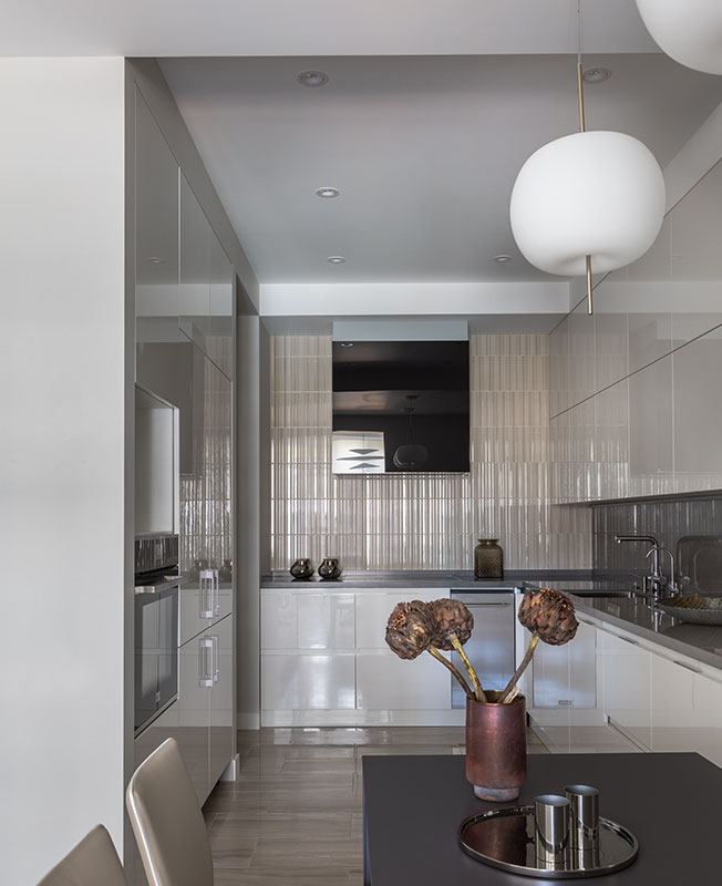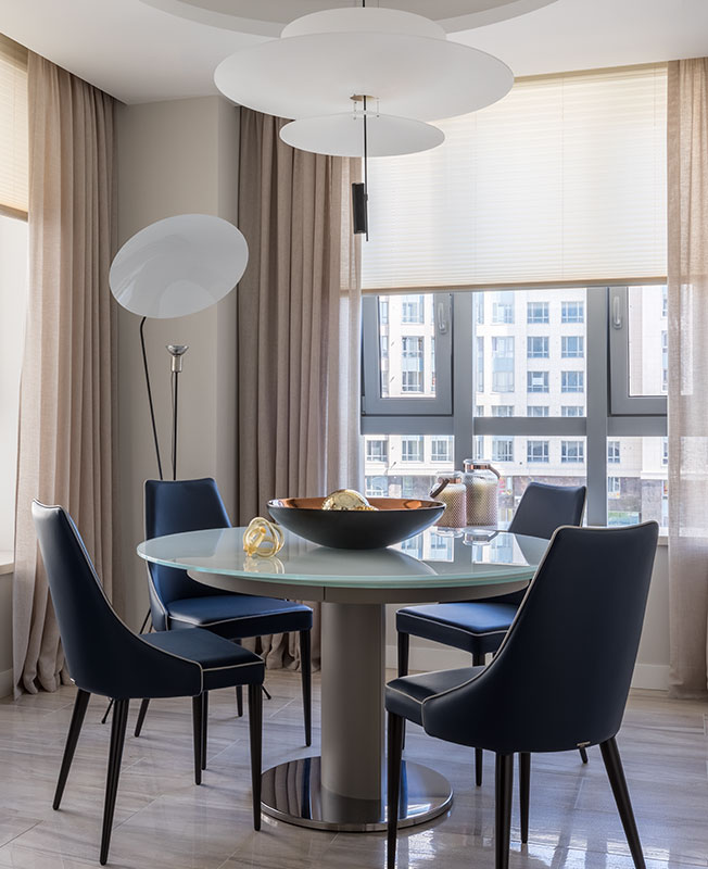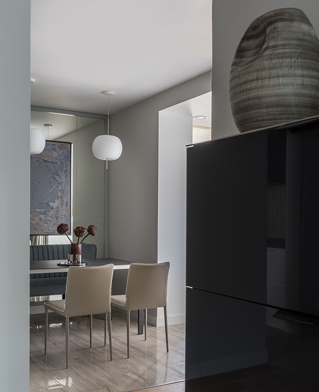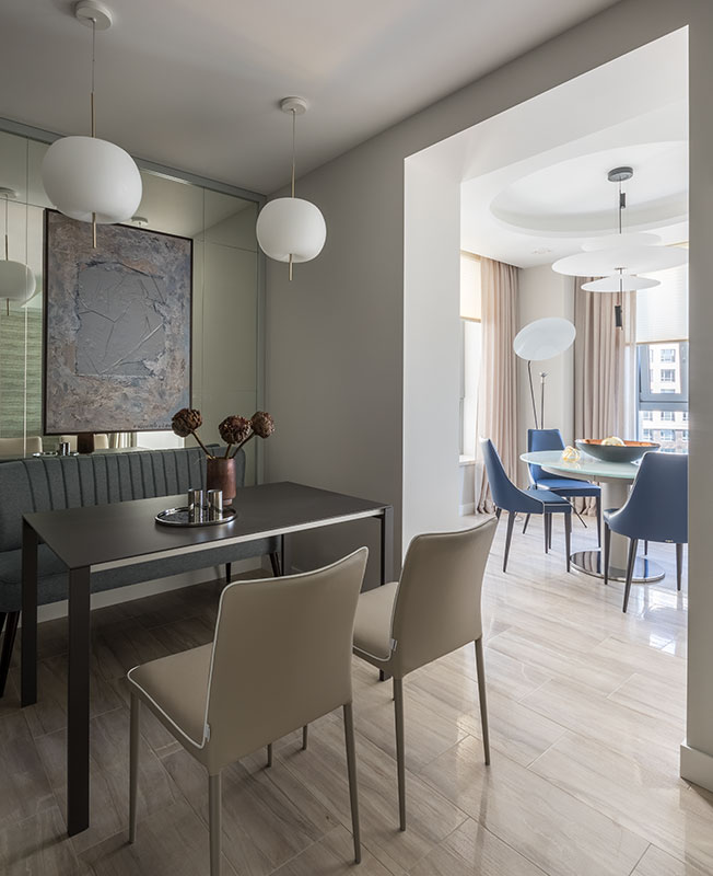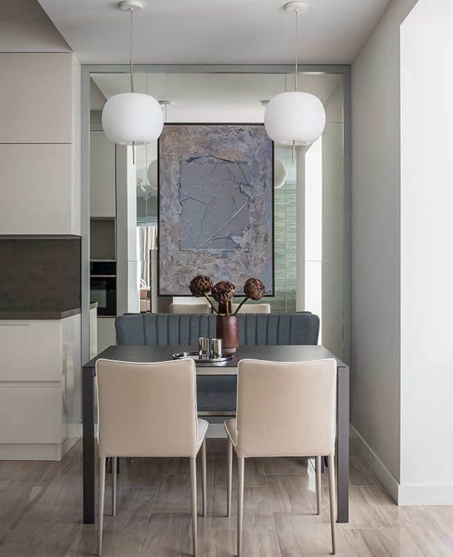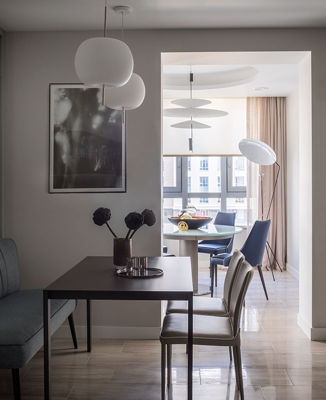 Обе лоджии утеплили, добавив квартире полезную площадь. На месте одной из них сформировали столовую с широким проемом, благодаря чему кухня наполнилась естественным светом. Здесь же оборудовали компактную зону для семейного завтрака, а для приема гостей — просторную столовую с большим обеденным столом.