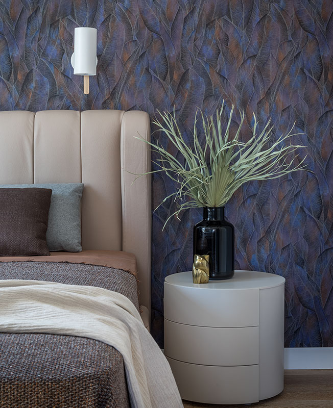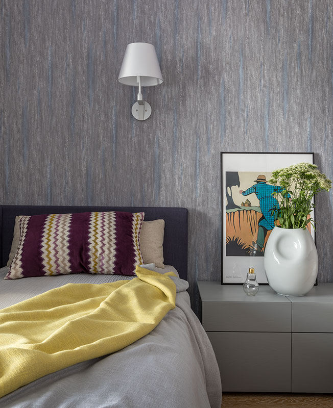 Предпочтение отдали светлой цветовой гамме, выкрасив стены в единый спокойный оттенок. Акцент сделали на обоях — для гостиной и спальни выбрали обои с текстурой травертина и сине-терракотовым принтом в виде листьев.