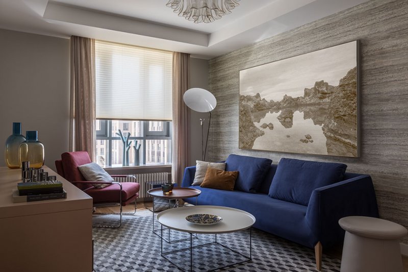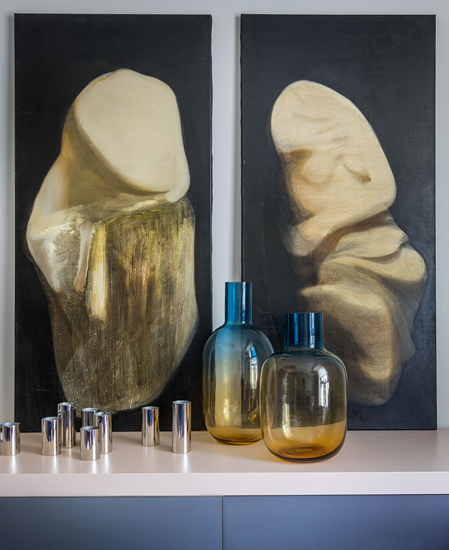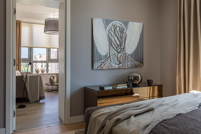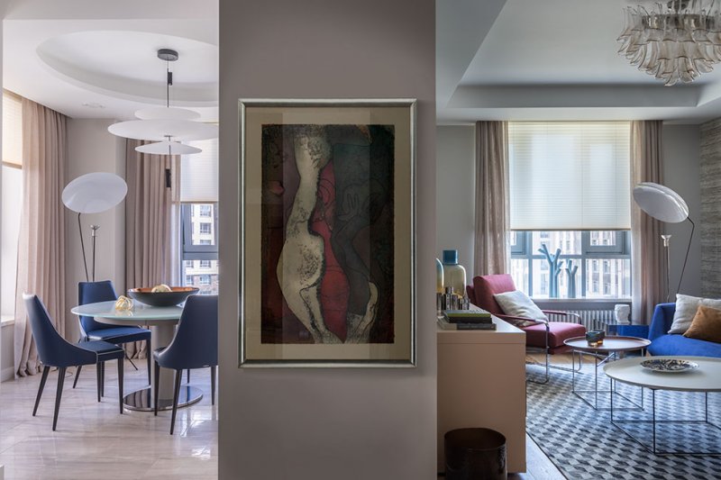 Корпусную мебель, гардеробные и кухню изготовили на заказ в столярной мастерской. Добавили дизайнерские предметы — журнальные столики B&B Italia по дизайну Патриции Уркиолы, знаменитую птичку Vitra Чарльза и Рэй Измзов, вазы Ligne Roset от Ноэ Дюшофур-Лоранса, а также эффектный свет, например, настольный светильник Artemide работы Наото Фукасавы. Также важными участниками пространства стали предметы современного искусства — картины и фотоработы одновременно выступают яркими акцентами, но при этом являются частью общей концепции.