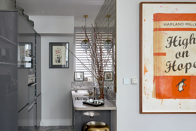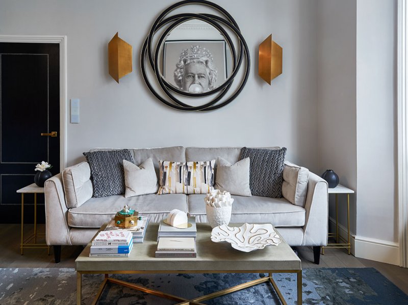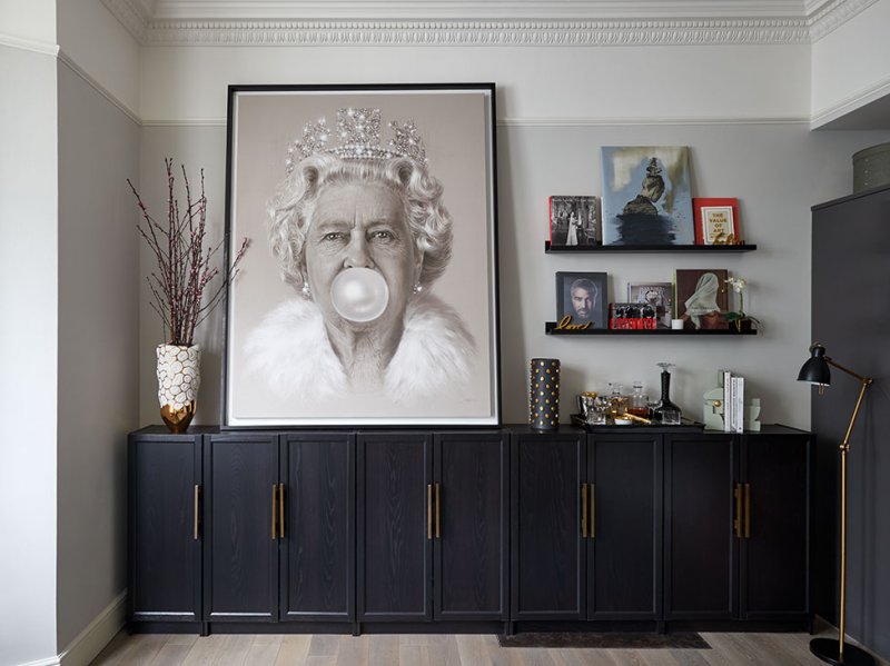Основой интерьера стала традиционная для лондонских домов цветовая гамма с нейтральными стенами, темной корпусной мебелью и яркими акцентами в виде современного искусства.