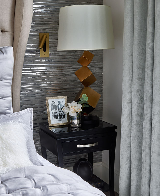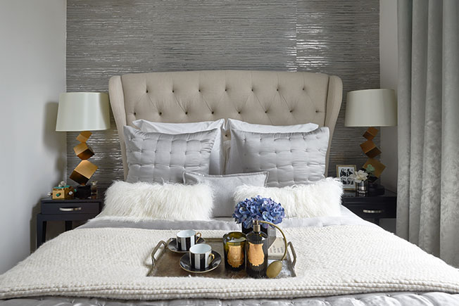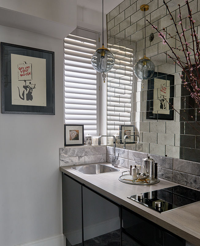 Чтобы визуально расширишь пространство маленькой кухни, одну из стен оформили зеркальной плиткой, которая также отражает свет из маленького окна. Еще одна интересная поверхность в квартире — стена за изголовьем в спальне, оформленная обоями с металлизированным эффектом.