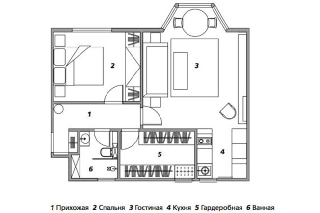В результате на небольшой площади удалось разместить гостиную, кухню, спальню, гардеробную (изначально на ее месте планировалась гостевая), ванную комнату и холл.