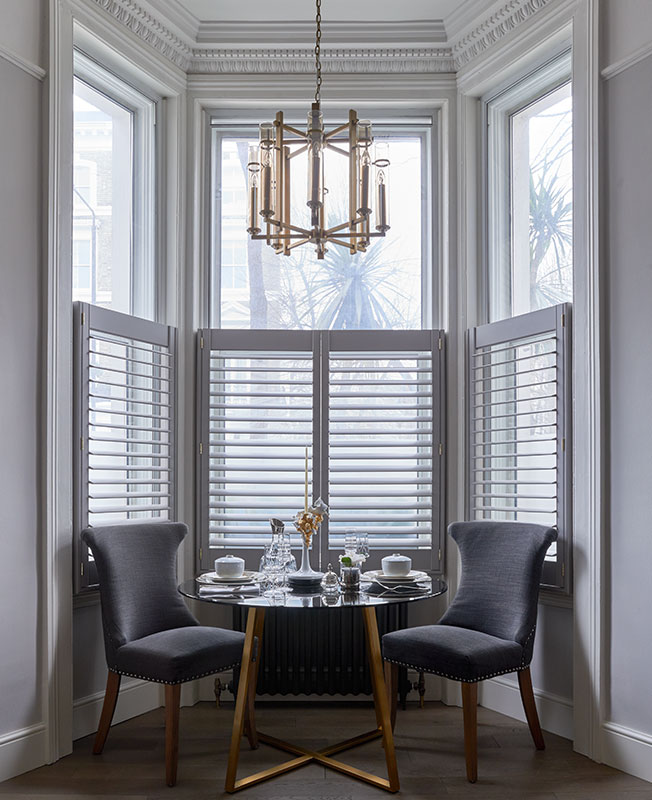 Комактную столовую зону расположили в эркере. Ольга решила частично оформить окна шаттерсами (ставнями), которые дизайнер ни разу не использовала в своих проектах, но непременно хотела видеть у себя дома. Такое решение обеспечило и приватность (квартира все же расположена на уровне земли), и достаточное количество естественного света.