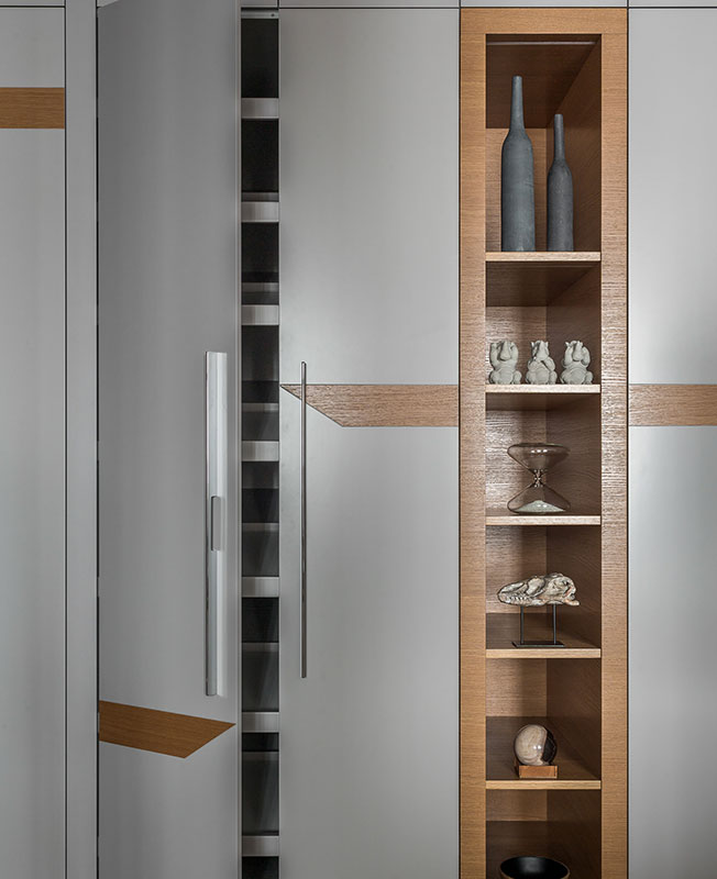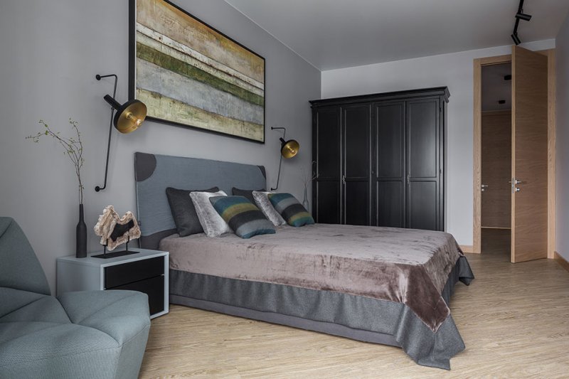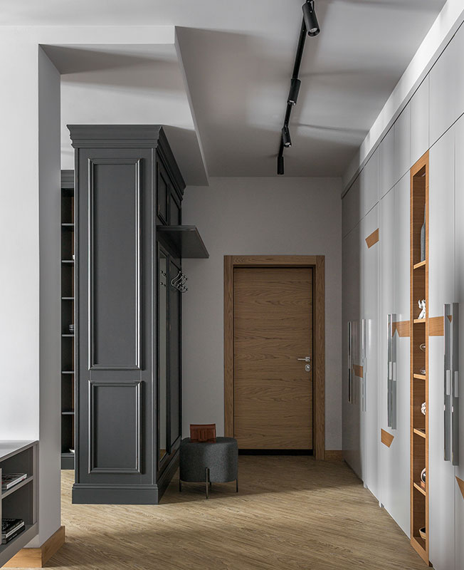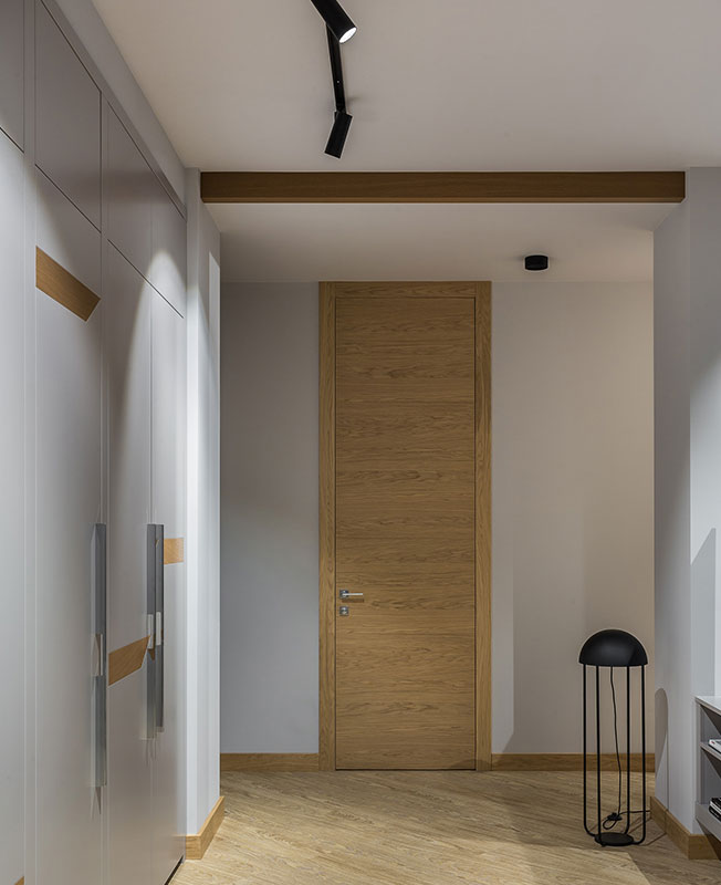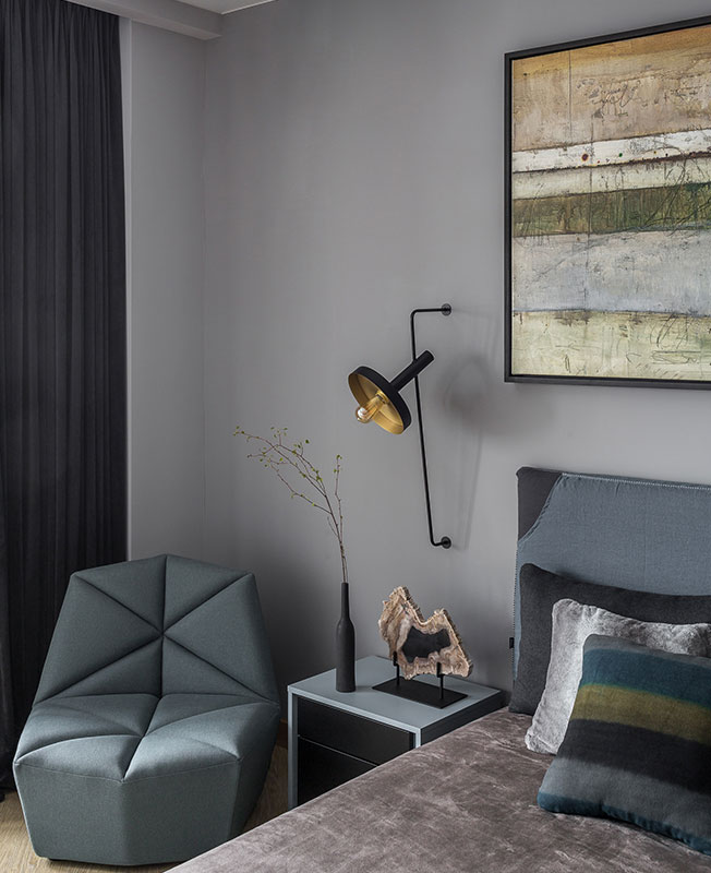 Именно панно стало отправной точкой дизайна этого спокойного, сдержанного интерьера. «В процессе комплектации проекта я обратил внимание на небольшие настенные светильники, по форме напоминающие камни для го. Мгновенно в голове нарисовалась картина — разлинованная деревянная доска с расположенными на них игральными камнями белого и черного цвета», — рассказывает о проекте Кирилл Егоров.