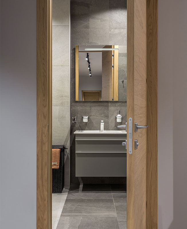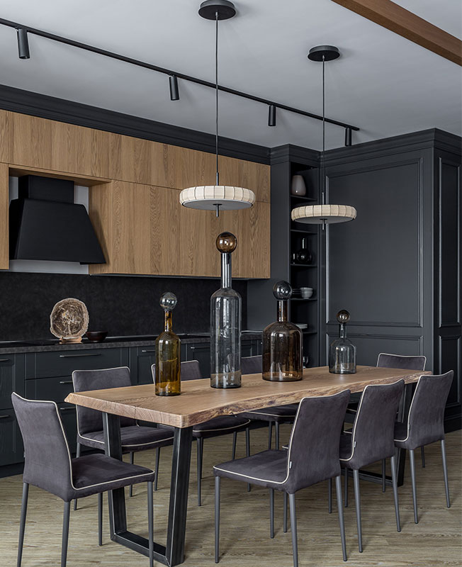 Отделочные материалы и цветовую палитру выбирали максимально простые, лаконичные. В интерьере преобладают разные оттенки серого от почти черного до светлых тонов, также одну из ведущих ролей играет натуральная древесина. Композиционные перепады в уровнях потолков подчеркнуты деревянными балками, что добавляет комнатам ритмичности.