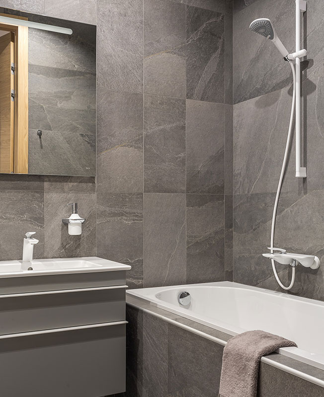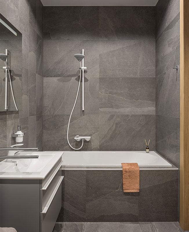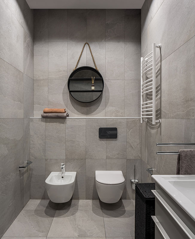 Гостевая зона получилась просторной и легкой для восприятия. Эффект цельного пространства усиливается за счет единого для всей квартиры серого цвета стен и напольного покрытия. Главная спальня и детская остались изолированными. Раздельные санузлы также объединили, исключив «лишнюю» дверь из композиции коридора.