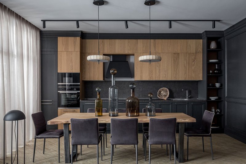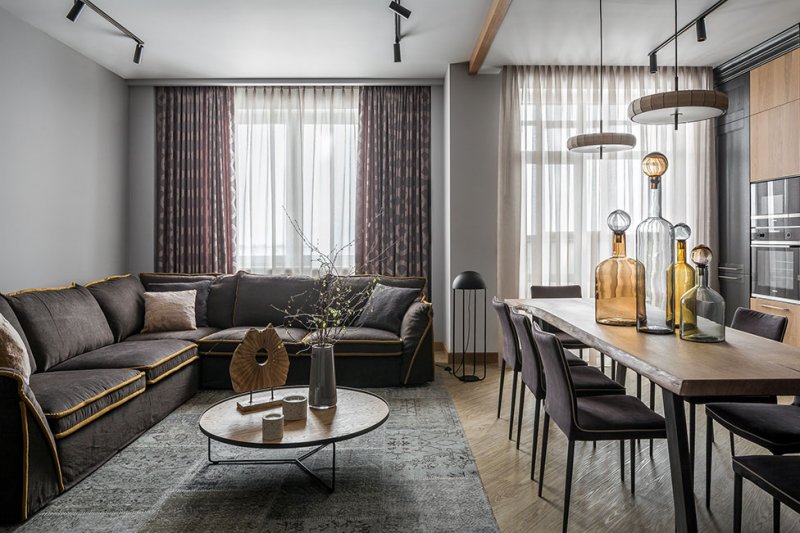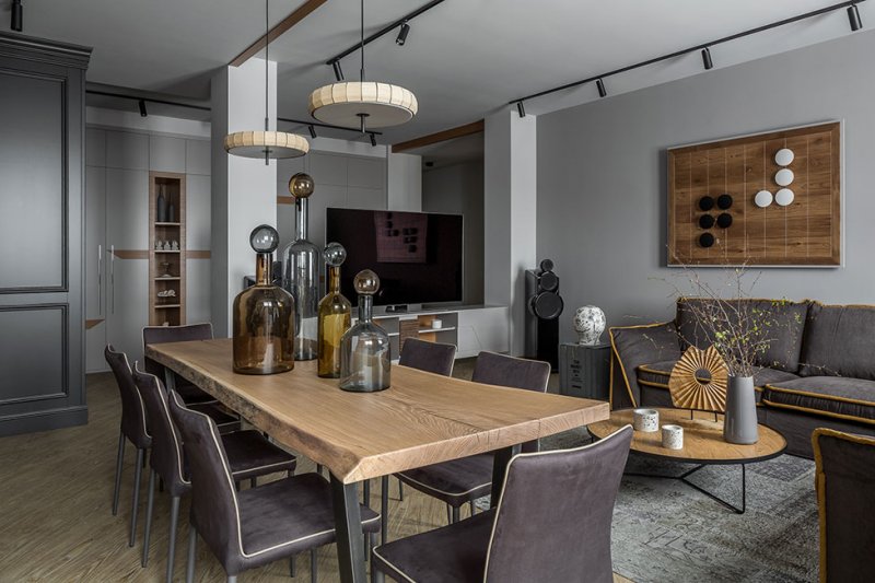 Кирилл Егоров оформил квартиру в новом доме для семьи заказчика, с которым уже неоднократно работал. На этот раз дизайнер создал интерьер 110 кв. метров для старшего сына. Основное пожелание — квартира с «мужским» характером, лаконичная по дизайну, без лишнего декора, экономичная в реализации, но при этом с оригинальной концепцией. Застройщик предложил невыразительную планировку с широким коридором, большим количеством дверей и небольшими комнатками. В первую очередь дизайнер объединил кухню-гостиную и прихожую-коридор в открытое просторное помещение, зонированное встроенной мебелью. Гостевая зона получилась просторной и легкой для восприятия. Эффект цельного пространства усиливается за счет единого для всей квартиры серого цвета стен и напольного покрытия. Главная спальня и детская остались изолированными. Раздельные санузлы также объединили, исключив «лишнюю» дверь из композиции коридора. Отделочные материалы и цветовую палитру выбирали максимально простые, лаконичные. В интерьере преобладают разные оттенки серого от почти черного до светлых тонов, также одну из ведущих ролей играет натуральная древесина. Композиционные перепады в уровнях потолков подчеркнуты деревянными балками, что добавляет комнатам ритмичности. Встроенная мебель выполнена на заказ по эскизам дизайнера. Кухонный гарнитур, система хранения в прихожей и тумба для ТВ выступают нейтральным фоном для акцентов — крупного углового дивана и обеденного стола со столешницей из слэба дуба. Еще один интересный элемент гостиной — панно, исполненное по мотивам игры го. Именно панно стало отправной точкой дизайна этого спокойного, сдержанного интерьера. «В процессе комплектации проекта я обратил внимание на небольшие настенные светильники, по форме напоминающие камни для го. Мгновенно в голове нарисовалась картина — разлинованная деревянная доска с расположенными на них игральными камнями белого и черного цвета», — рассказывает о проекте Кирилл Егоров. nonehttps://www.instagram.com/ego.house/https://www.facebook.com/egok.house/https://www.ego.house/