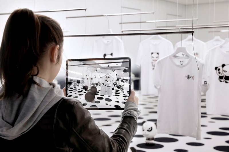Стоит навести на интерьер камеру смартфона, как он оживает — с помощью цифровых и аналоговых взаимодействий: дополненной реальности и различных световых сценариев. Одежда начинает поворачиваться в такт невидимых шагов, пространство наполняют висящие в воздухе сферы, а сам панда-маскот появляется перед посетителем.