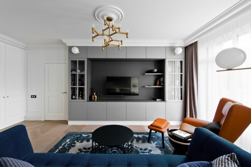 Современная планировка и дизайн интерьера 75-метровой квартиры основаны на принципах здорового минимализма. Серые и цветные капли в современном интерьере прекрасно соотносятся друг с другом, а подбор и сочетание отделочных элементов максимально используют потенциал места.