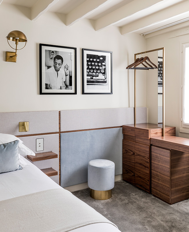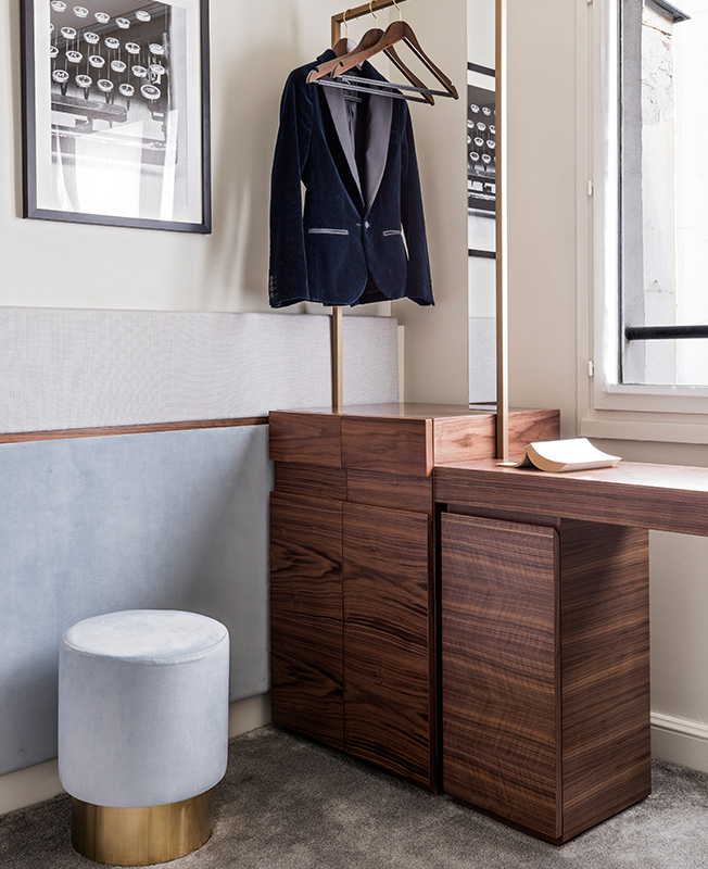 Для маленьких очаровательных комнат Станислас выбрала благородные и неподвластные времени материалы: ткани, очень близкие к костюмным, подыгрывающие парижской моде, бархат, натуральное дерево... Мебель, созданная Изабель Станислас в стилистике 60-х, относит к Сержу Гейнсбургу и Джеймсу Болдуину.