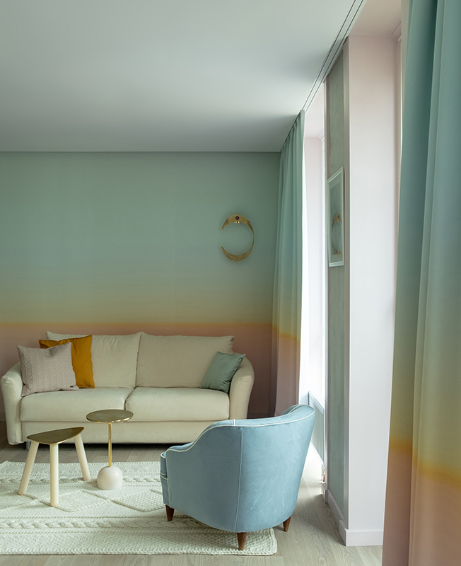 Дизайнер Павел Воловов завершил квартиру в московской новостройке: площадь 37 кв. метров, бюджет — около 1 миллиона рублей. Обои и шторы в градиенте выполнены мастерской Solstudio Textile Design по проекту Павла Воловова.
