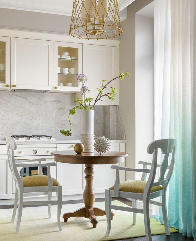 Дизайнер Ольга Тищенко оформила квартиру c богатой историей и уникальным наследием. В интерьере кухни два цветовых акцента: градиент лазурного синего на шторах (подбирали цвет похожий на небесный синий в солнечную погоду) и теплый горчичный градиент у ковра. Ковер The Rug Company, лен от Sanderson.