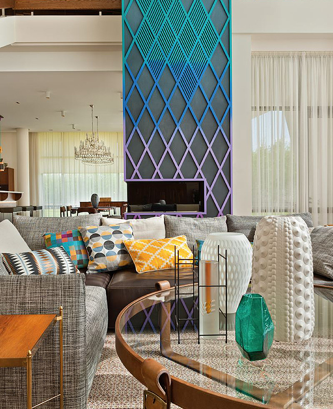 Знаковый проект архитектурного бюро PANACOM — «Дом-питон» на Новорижском шоссе. Вертикаль дымохода, пронзающая дом, декорирована орнаментом из цветных ромбов: он вносит в интерьер динамику. Цветовая палитра — достаточно яркая — подбиралась в соответствии с темпераментом хозяев, жизнерадостных, позитивных людей.
