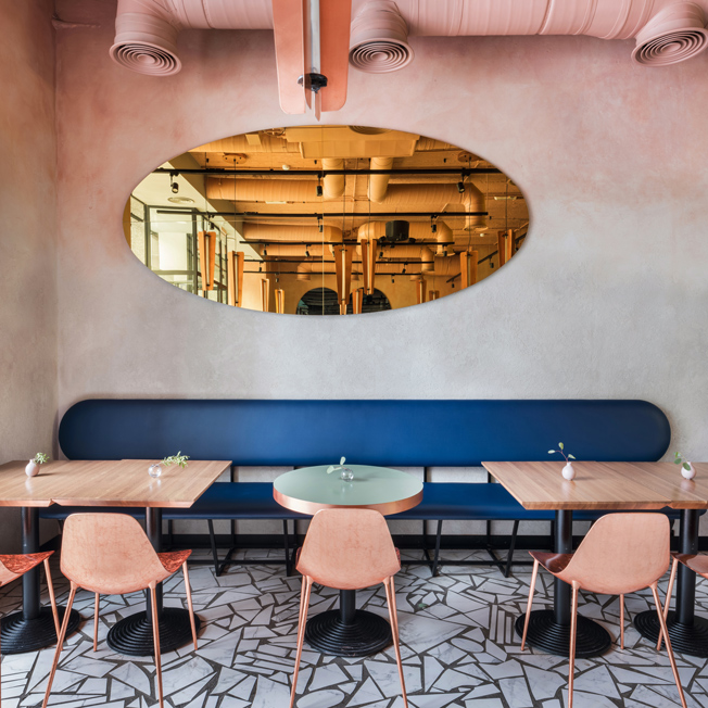Дизайнеры Veter Design & Architecture создали интерьер для новой сети городских кафе. Cooker’s Gourmet Cafe Кузнецком Мосту стало пионером и флагманом заведений гурме бистро в Москве. По стенам идет двойной градиент: серый и пыльно-розовый цвет перетекает на потолок, так же как и сама фактура, снизу более грубая к верху она растворяется превращаясь в гладкую поверхность.