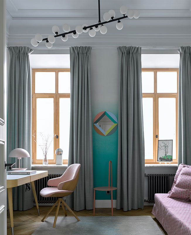 Тарас Безруков и Стас Самкович, ТS-Design, спроектировали квартиру площадью 115 кв. метров в ЖК «Велтон Парк». Для молодой семьи с двумя детьми они создали открытый, светлый интерьер с небанальным декором. В комнате дочери на окнах шторы из ткани Scion.