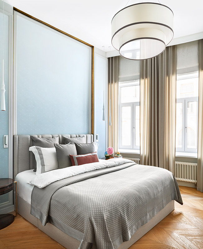 Елена Соловьева и Илья Климов, «Арт-бюро 1/1» — мастера рафинированных европейских интерьеров. В проекте квартиры в Барыковском переулке им удалось передать ощущение, словно за окнами не Москва, а Париж. Изголовье кровати по дизайну «Арт-бюро 1/1». Текстиль Lelievre.