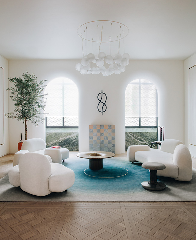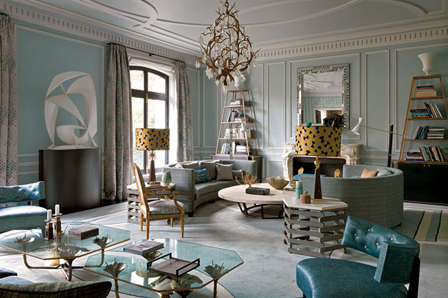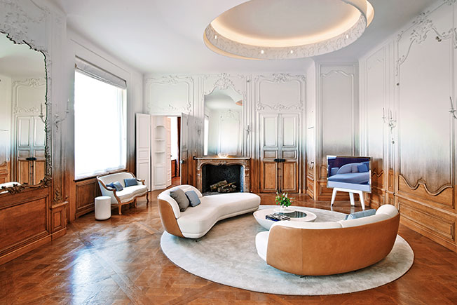 Жан-Луи Деньо. Парижская гостиная. Ковер с градиентом вторит оттенку стен и мягкой мебели.