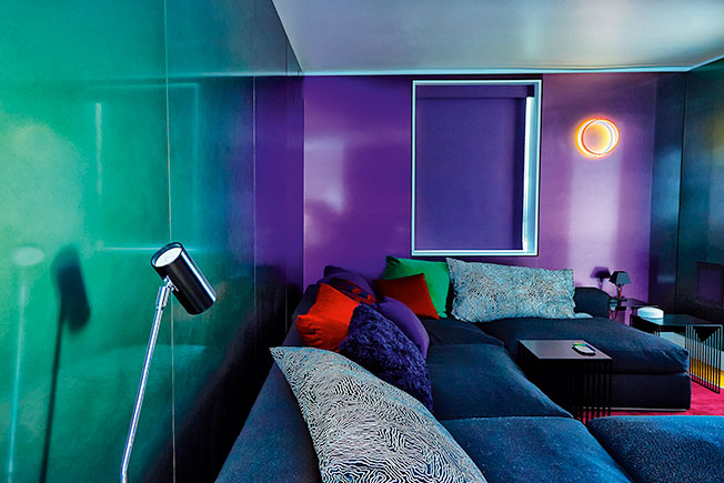 Дом Кары Делевинь — проект бюро Waldo Works. Домашний кинотеатр. Стены покрыты фиолетовой и зеленой автомобильной краской. Здесь хозяйка прячется в периоды джетлага.