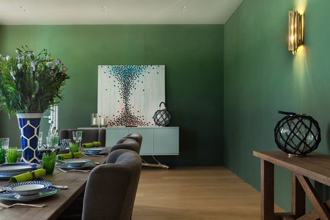 Вилла в Жуковке XXI — проект архитектора Ланы Гриневой (бюро PHD, Philosophy of Design) в жанре «дом под ключ». Обычно российские дома с готовым интерьером отличаются сдержанной палитрой с преобладанием бежевого, что вполне отражает среднестатистический российский вкус. Но здесь авторы рискнули: выбрали насыщенные зеленые и глубокие синие тона, а в столовой и спа использовали технику деграде: оттенки перетекают из темных в светлые, из зеленых в аквамарин и обратно.