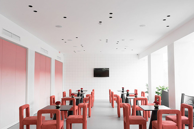 В городе Буча, в 30 километрах от Киева, появилось нетипичное пространство — образовательный центр Portal по дизайну Виктории Якуши. Интерьер площадью 200 кв. метров минималистичен до аскетизма. Невесомые розовые панели, окрашенные градиентом, словно растворяются в пространстве.