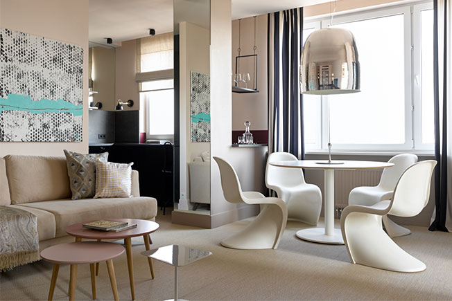 Агнес Рудзите мастерски работает с цветом. Но этот проект даже в ее портфолио можно признать смелым и ярким: в квартире, которая находится в центре Риге, дизайнер использовала палитру Майами. Кухня изготовлена по эскизам автора проекта из крашеных панелей МДФ.