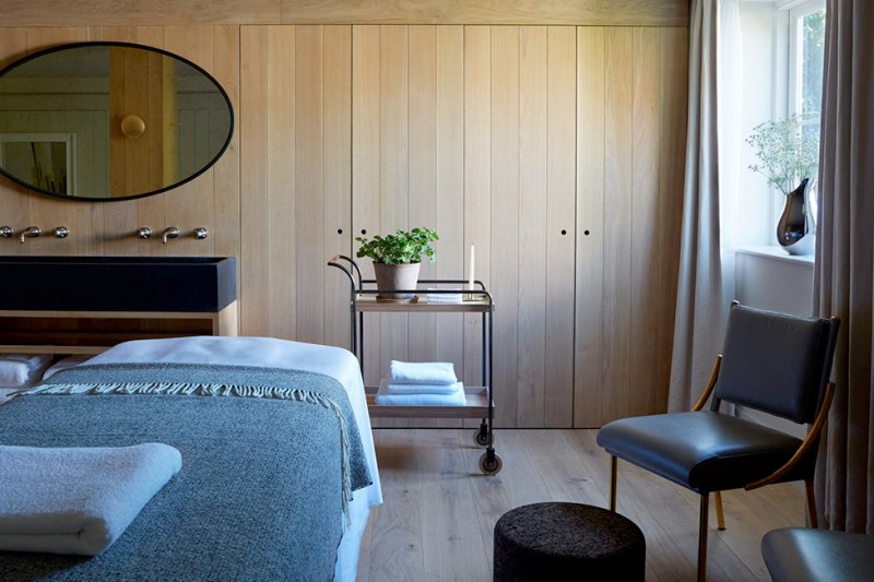 Британский дизайнер Бен Томпсон соединил величие георгианской усадьбы с неформальным стилем современного фермерского дома, создав интерьеры отеля в Хэмпшире. Томпсон был приглашен для редизайна интерьеров, после того как предыдущий его коллега не справился с задачей. Результат пока успешен — отель упоминает среди своих недавних гостей принца Гарри и Меган Маркл. Heckfield Place — это загородный дом XVIII-го века, отремонтированный ради 44 гостевых люксов, двух ресторанов, спа-салонов и подземного кинотеатра. Он расположен в самом центре обширного поместья, где на ферме производят натуральные продукты и всегда есть свежие цветы. Задачей было создать интерьер с уважением к истории георгианского здания, но также адаптировать его к современным требованиям и позволить гостям чувствовать себя как дома. Стратегия Томпсона состояла в том, чтобы сохранить некоторые пространства в здании достаточно традиционными, с несколькими ключевыми современными элементами, создающими контраст. Другие же — сделать более эклектичными, соединить старое и новое, рустикальное и минималистичное. «Было весело играть со слоем восстановленной исторической ткани здания, — говорит дизайнер. — Например, спальни на верхних этажах, которые раньше были комнатами для прислуги, имеют несколько более сложную архитектурную эстетику и обставлены более скромным, наивным антиквариатом. Мы использовали современные объекты, чтобы обозначить свое вмешательство внутри здания, вместо того, чтобы симулировать традиционную уместность». Шесть из 44 комнат — с выраженной индивидуальностью: каждая с уникальным дизайном и цветовой палитрой, разработанной в соответствии с положением комнаты в доме и видом из окна. Самый просторный люкс Long Room расположен в мансарде, под наклонной крышей из массивных дубовых балок. С балкона открывается живописный вид на озеро. «Мы хотели подчеркнуть естественный осенний характер номера из-за этого вида на деревья и папоротники», — объясняет дизайнер. В другом номере — Ochre Room — традиционная мебель контрастрастирует с преобладающей насыщенно-желтой палитрой и темно-коричневым мрамором в ванной комнате. Panelled Room, напротив, отличают светлые тона. Стены в номере отделаны деревянными панелями. Некоторые детали, характерные для этих шести комнатах, также встречаются в стандартных люксах. Например, изготовленные на заказ буфеты с напитками и закусками для гостей, а также канцелярские принадлежности, которые можно найти на столах. «Нам было важно учесть движение солнца через здание в течение дня, — говорит Бен Томпсон. — В тех комнатах, где оно оказывается утром, использованы более светлые, светоотражающие материалы. А помещения, выходящие на запад, освещенные закатными лучами, оформлены в более темных тонах, с роскошными материалами, которые лучше всего смотрятся в сумерках». Главный ресторан, где также подают завтраки, носит название Marle. В основе меню — фермерские продукты, а само пространство напоминает сад благодаря обилию растений и элементам из светлого мрамора. Второй ресторан Hearth занял пространство бывшего сарая. В главном доме также есть небольшой уютный бар с камином, диско-шаром и барной стойкой из полированной латуни. Каменная лестница ведет на нижний уровень в кинотеатр с обитыми кожей креслами. За домом — обширная территория с 