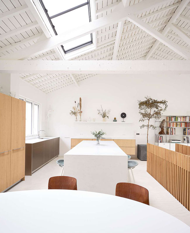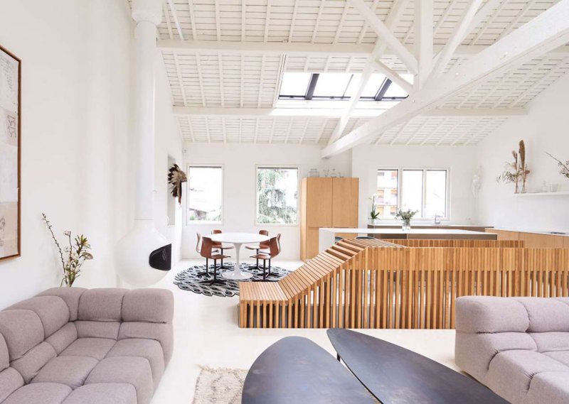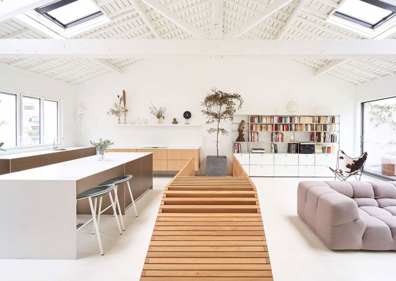Двусветной гостиной пришлось пожертвовать: чтобы увеличить полезную площадь верхнего этажа, достроили пол. Зато удалось открыть конструкцию крыши: деревянный потолок с его балками и решетчатой структурой, по мнению архитекторов, является самым необычным и интересным элементом пентхауса. Как и стены, и пол, потолок выкрашен в успокаивающий белый цвет. Естественным светом пространство обеспечивают многочисленные окна, включая раздвижные, ведущие на террасу, и мансардные.