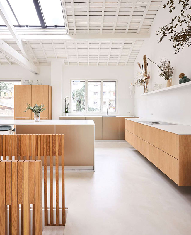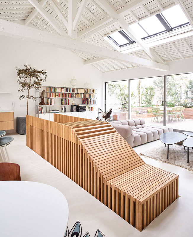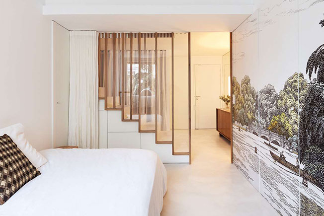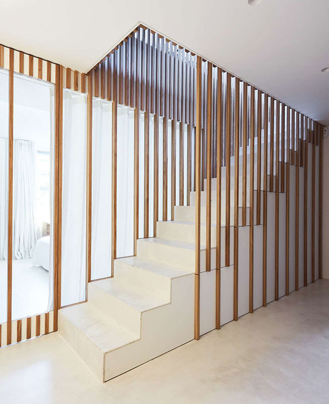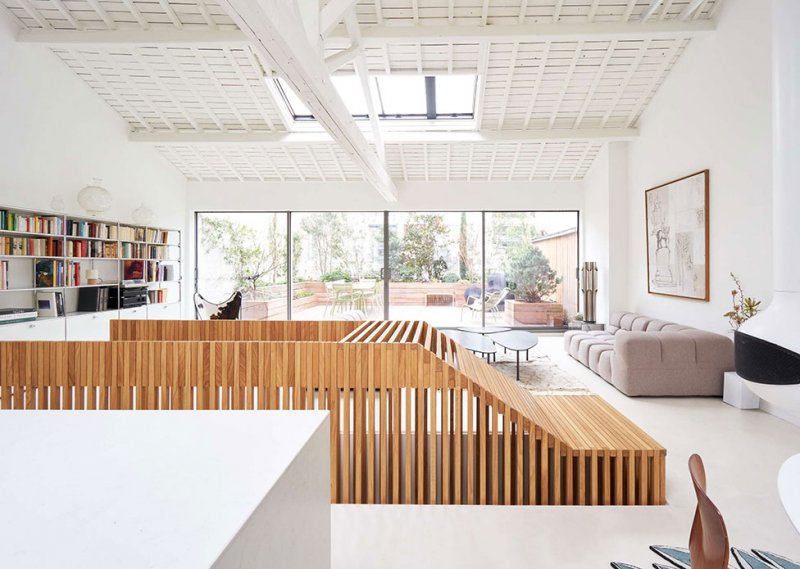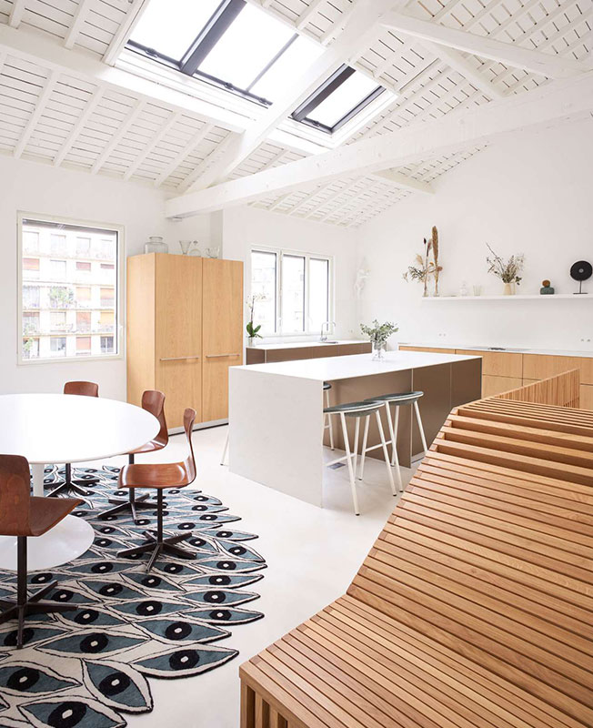 Испанские архитекторы Хуан Арнау Фаррас и Карме Муньос Рамирес, 05 AM arquitectura, обновили интерьер двухэтажного пентхауса площадью почти 172 кв. метра в 16-м округе Парижа. Просторная квартиры обладала большим потенциалам, но ее достоинства не использовались в полной мере. Первоначально основные жилые зоны располагались на нижнем этаже. Выйти на террасу верхнего этажа можно было лишь через двусветную гостиную. Из-за этого терраса крайне редко использовалась хозяевами. Кроме того, скатная крыша исторического здания была закрыта — сразу под ней располагалась мансарда, которую использовали как склад. Эти неудачные решения архитекторы решили исправить: предложили совершенно новую планировку, перенеся основные жилые помещения с нижнего уровня на верхний. Двусветной гостиной пришлось пожертвовать: чтобы увеличить полезную площадь верхнего этажа, достроили пол. Зато удалось открыть конструкцию крыши: деревянный потолок с его балками и решетчатой структурой, по мнению архитекторов, является самым необычным и интересным элементом пентхауса. Как и стены, и пол, потолок выкрашен в успокаивающий белый цвет. Естественным светом пространство обеспечивают многочисленные окна, включая раздвижные, ведущие на террасу, и мансардные. Центральная лестница, соединяющая объединенное пространство нового верхнего этажа со спальнями на нижнем уровне, также отделяет столовую и кухню от гостиной. В ней же предусмотрена скрытая система хранения. Деревянные планки, которыми оформлена лестница, рифмуются с рисунком потолка. Интерьер архитекторы наполнили эклектичным сочетанием мебели середины века и арт-объектов. Фоном для предметов, среди которых стол Tulip, созданный Ээро Саариненом для Knoll, и кресло Butterfly Chair, служит комбинация светлых тонов и деревянных фактур.