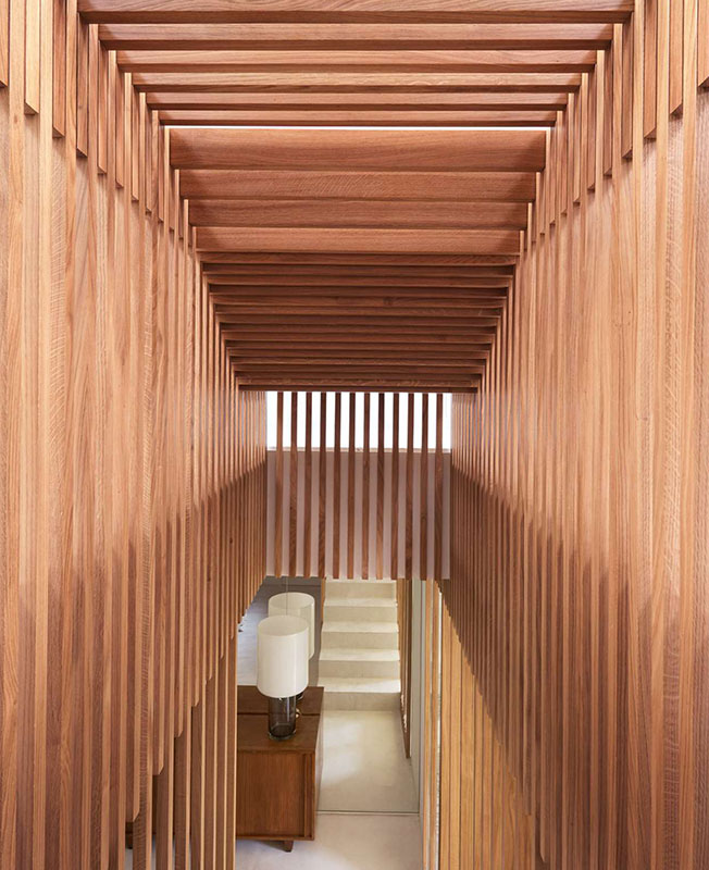 Центральная лестница, соединяющая объединенное пространство нового верхнего этажа со спальнями на нижнем уровне, также отделяет столовую и кухню от гостиной. В ней же предусмотрена скрытая система хранения. Деревянные планки, которыми оформлена лестница, рифмуются с рисунком потолка.