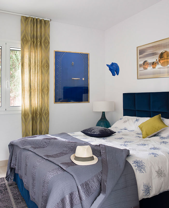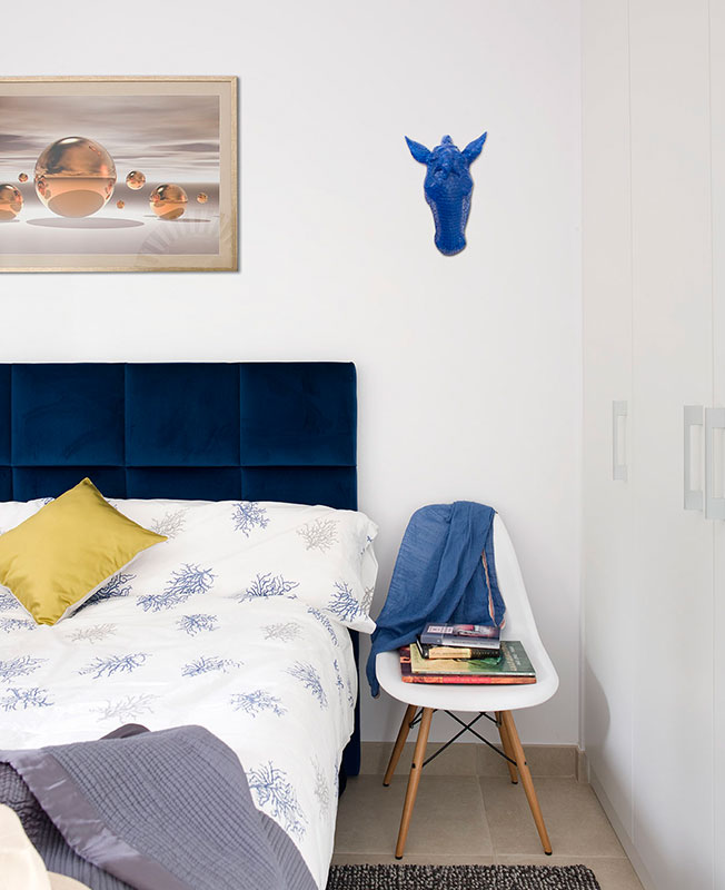 Гостевая спальня. Стул, Vitra. Кровать изготовлена на заказ, текстиль, JAB Anstoetz. На стене — декоративная голова лошади, Zara Home, выкрашена в синий цвет дизайнером.
